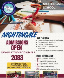समग्रमा, कुपोन्डोलस्थित नाइटिङ्गेल स्कुलले आधुनिक सोच, व्यवहारिक शिक्षण शैली र आत्मीय वातावरणमार्फत आफूलाई एक उत्कृष्ट शैक्षिक गन्तव्यका रूपमा स्थापित गरिरहेको छ। नयाँ शैक्षिक सत्रका लागि भर्ना खुला भएसँगै विद्यालयले फेरि एकपटक अभिभावक र विद्यार्थीहरूको ध्यान आकर्षित गरेको छ।